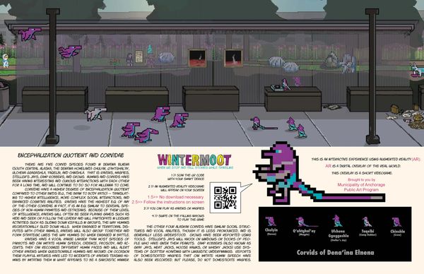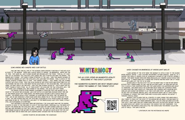 This work is a public art piece put up at the transit stop in the Anchorage Museum Sculpture Garden as part of Anchorage's 1% for the Arts. It is an augmented reality videogame folks can play in a minute or two while waiting for their bus to arrive.